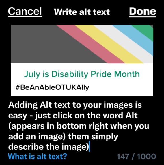 July 3rd Use the accessibility feature on twitter to make your tweets more accessible. https://help.twitter.com/en/using-twitter/accessibility-features#BeAnAbleOTUKAlly #DisabilityPrideMonth