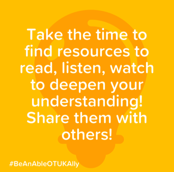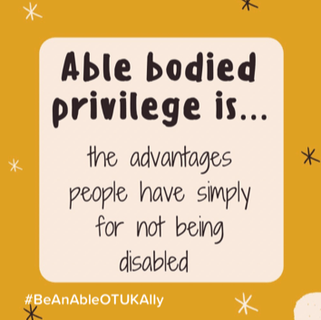 8th July Own your privilege. #BeAnAbleOTUKAlly by recognising the advantages, opportunities, resources, and power you have. This can be difficult, but it’s necessary to begin to understand others’ perspectives. When understood, privilege is a resource that can be used for good.#DisabilityPrideMonth and #BeAnAbleOTAlly