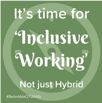 11th July #BeAnAbleOTUKAlly and activity prompt, inclusive ways of working. Challenge the expectation to return to ‘normal’ ways of working. #DisabilityPrideMonth https://www.hrzone.com/perform/people/why-inclusive-working-not-hybrid-working-should-become-the-new-norm