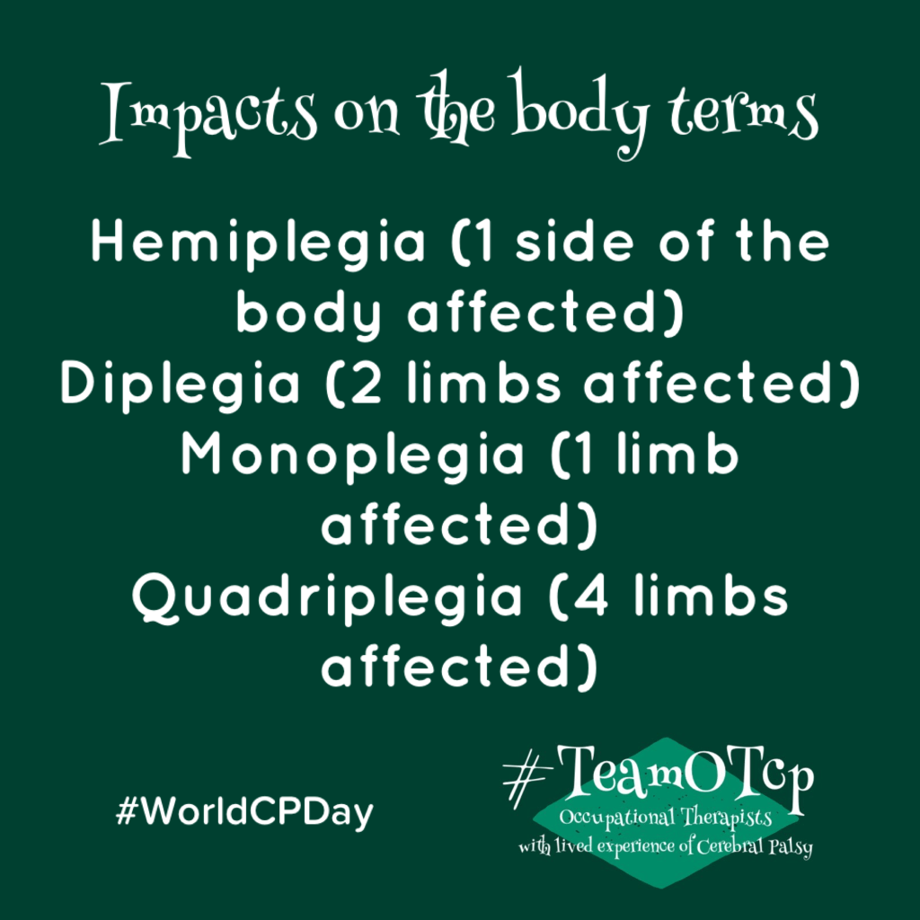 Types of cerebral palsy include; Dyskinectic, Ataxic, & Spastic which can impact all or parts of the body Monoplegia (1 limb affected) Quadriplegia (4 limbs affected) Hemiplegia (1 side of the body affected) Diplegia (2 limbs affected)