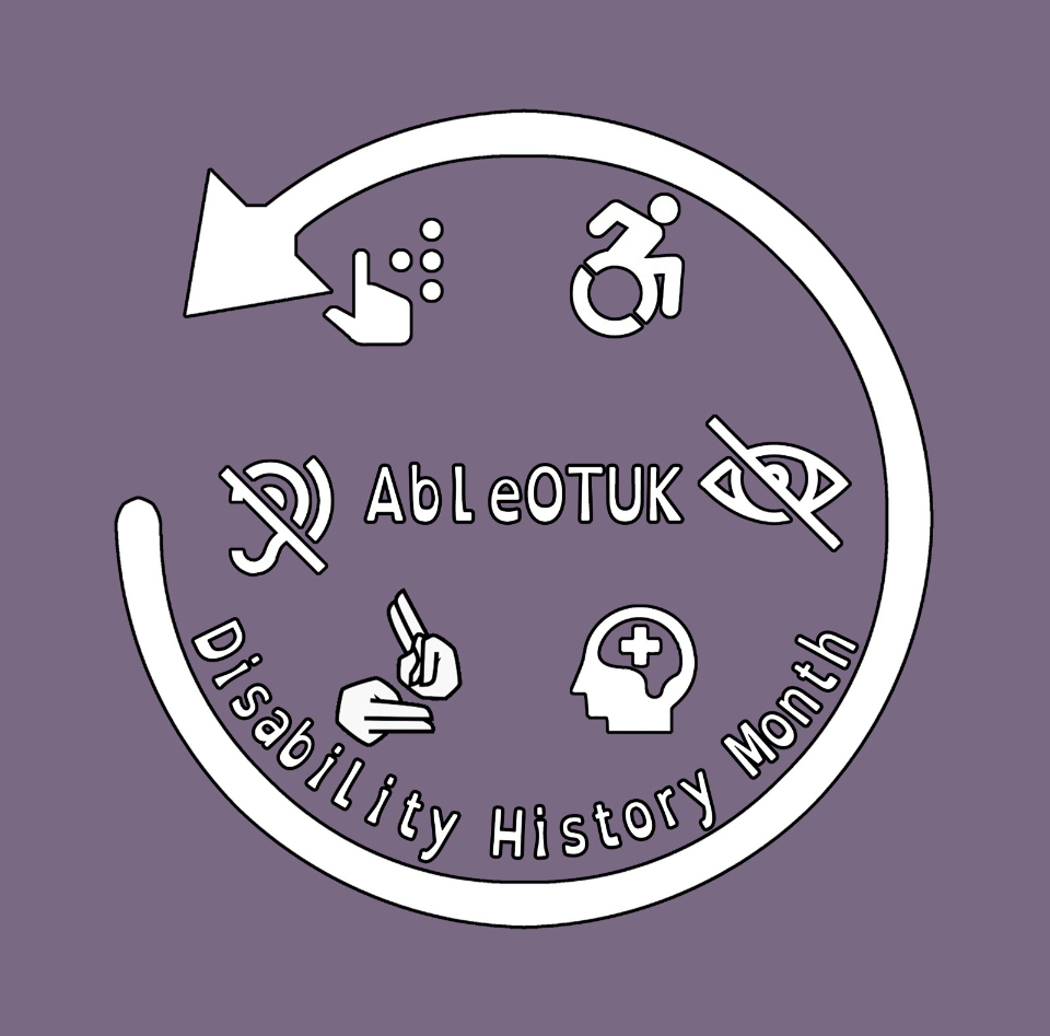 Alt text – Image of AbleOTUK logo for Disability History Month Purple background, in the center a white circular arrow pointing anti clockwise to symbolise history. Inside the circle 6 images of Accessible symbols in white. Words on image – AbleOTUK Disability History Month