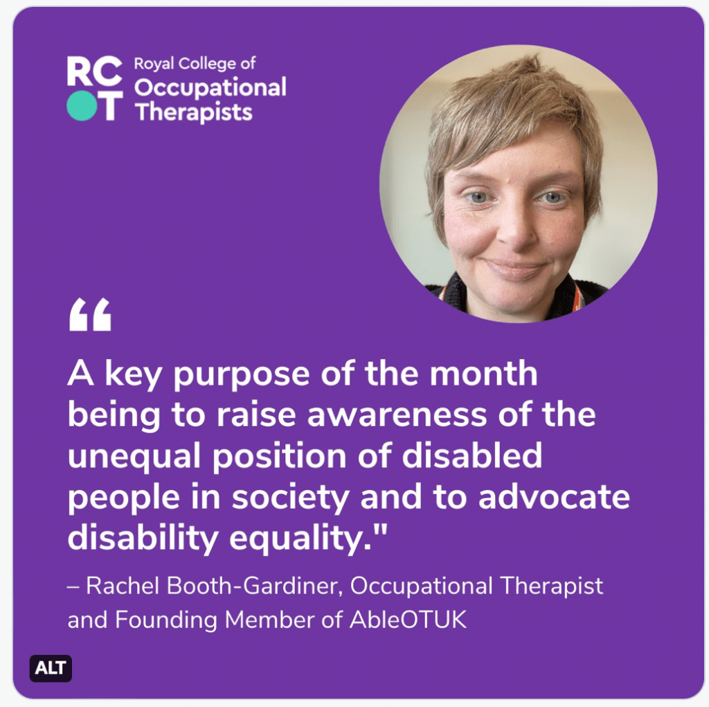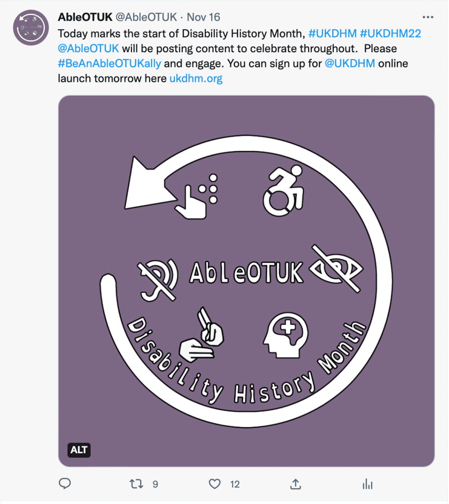 Today marks the start of Disability History Month, #UKDHM #UKDHM22 @AbleOTUK will be posting content to celebrate throughout. Please #BeAnAbleOTUKally and engage. You can sign up for @UKDHM online launch tomorrow here https://ukdhm.org