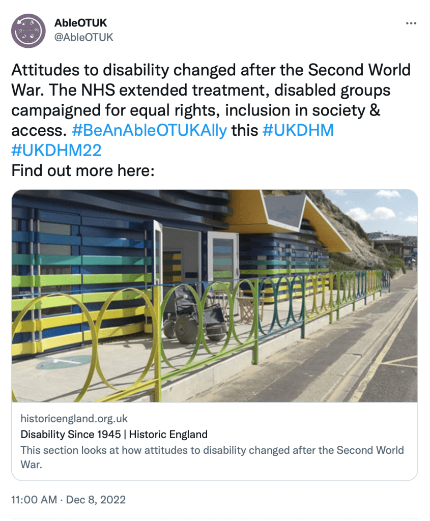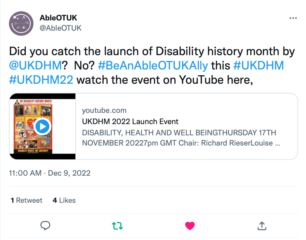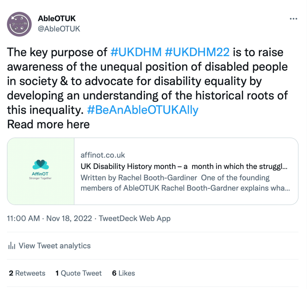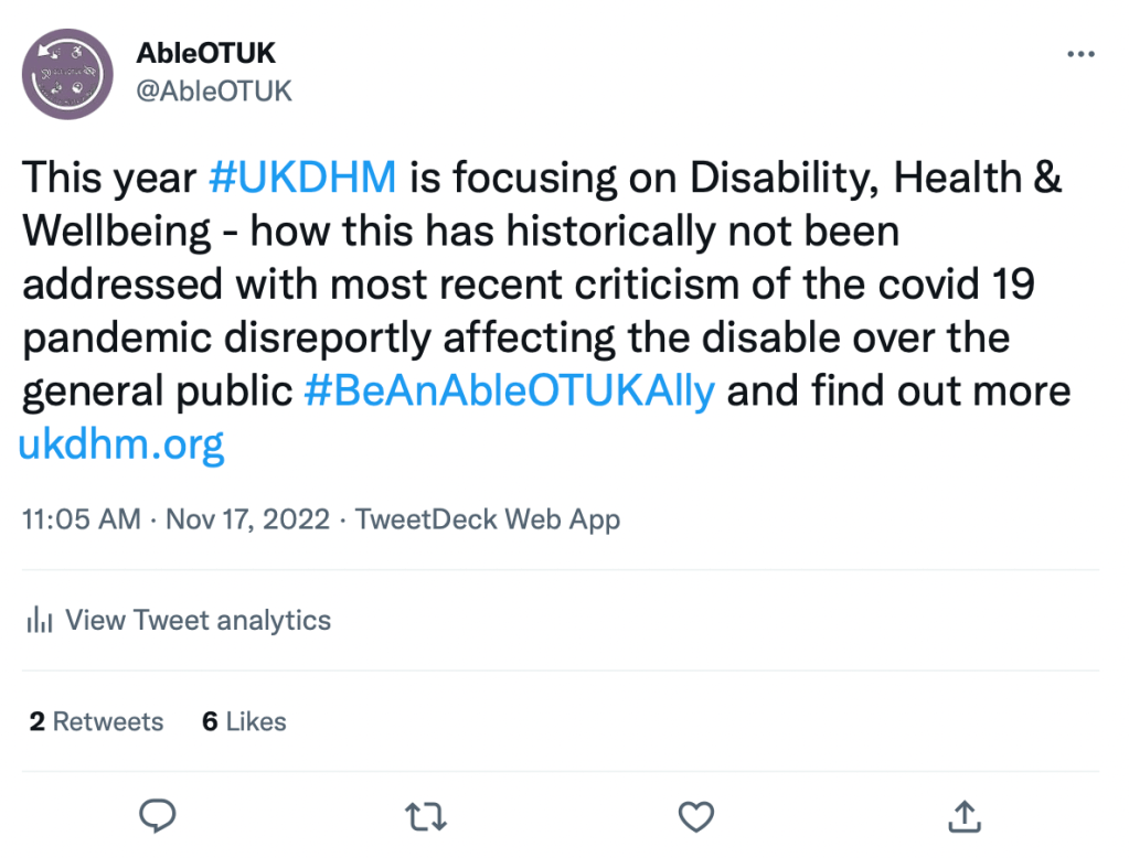 17th November 2022 This year #UKDHM is focusing on Disability, Health and Wellbeing, and how this has historically not been addressed with most recent criticism of the covid 19 pandemic disreportly affecting the disable over the general public. #BeAnAbleOTUKAlly and find out more https://ukdhm.org