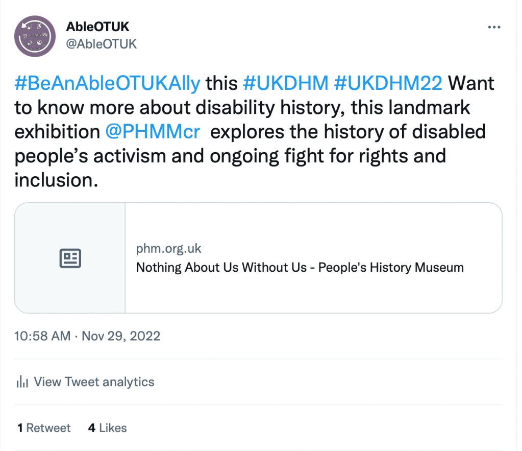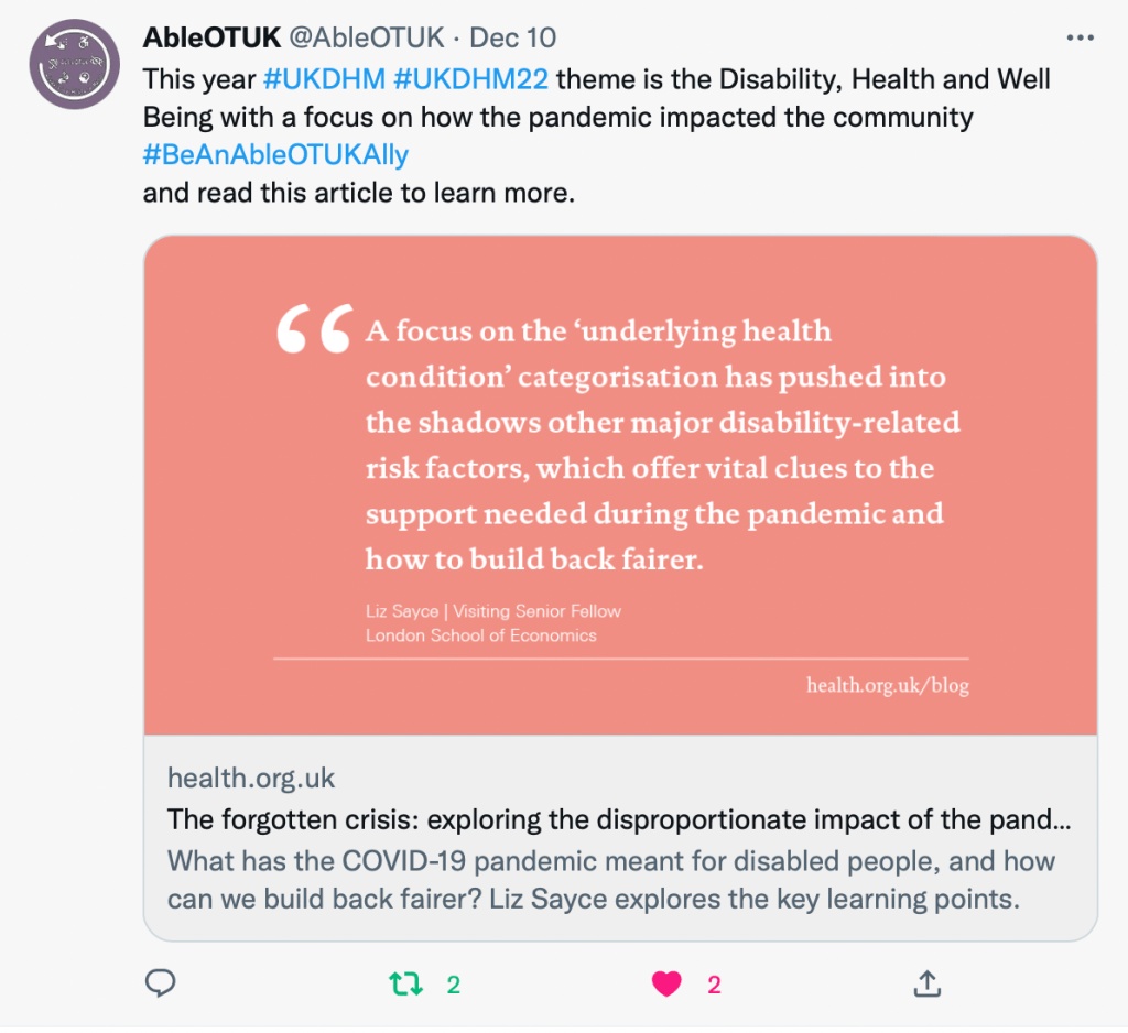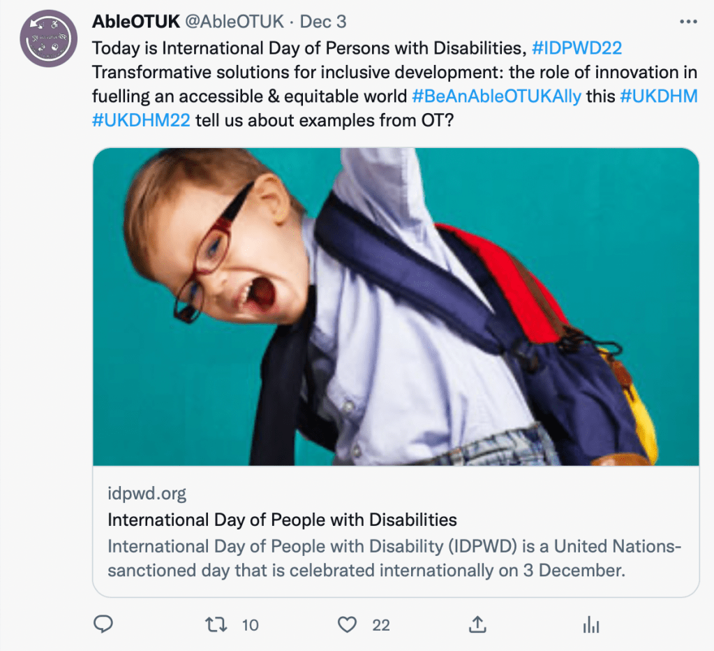 17th November 2022 This year #UKDHM is focusing on Disability, Health and Wellbeing, and how this has historically not been addressed with most recent criticism of the covid 19 pandemic disreportly affecting the disable over the general public. #BeAnAbleOTUKAlly and find out more https://ukdhm.org