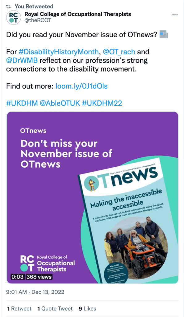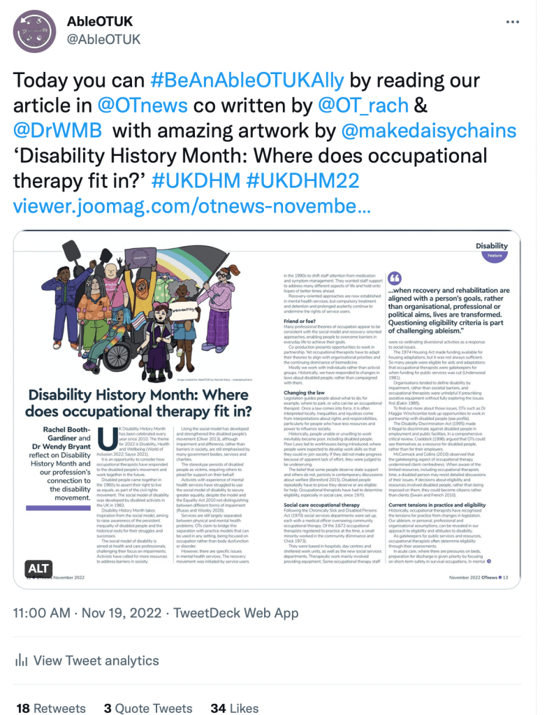 19th November 2022 – Today you can #BeAnAbleOTUKAlly by reading our article in @OTnews co written by @OT_rach & @DrWMB with amazing artwork by @makedaisychains ‘Disability History Month: Where does occupational therapy fit in?’ #UKDHM #UKDHM22 November 2022 OT News Pages 12-15.