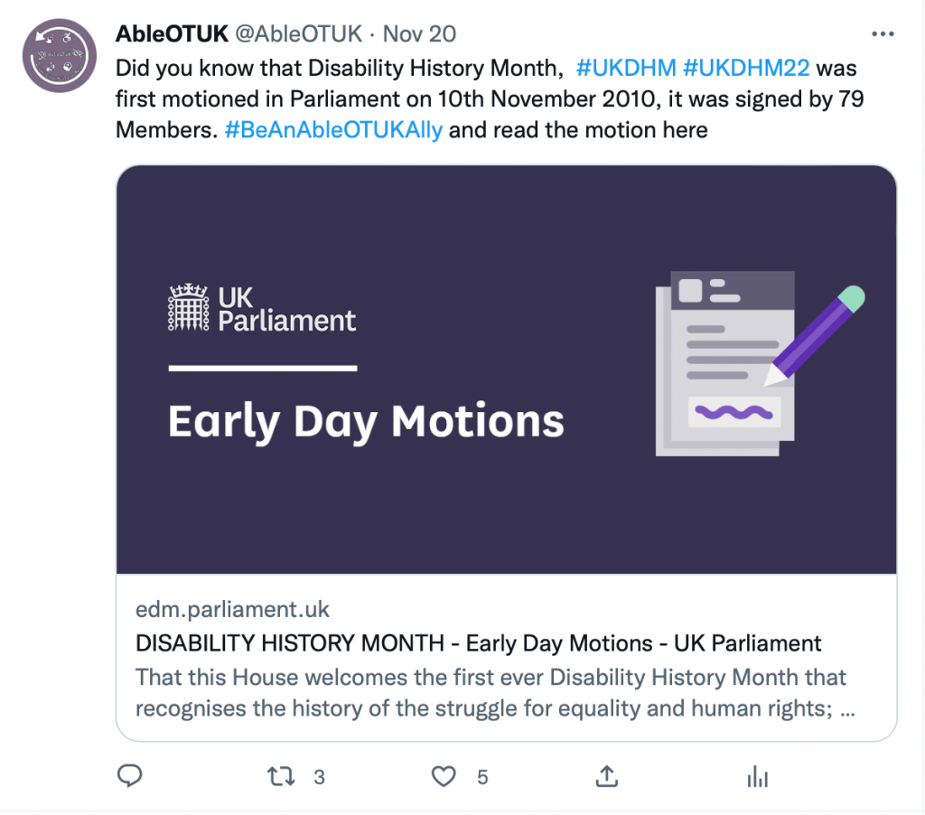 Did you know that Disability History Month, #UKDHM #UKDHM22 was first motioned in Parliament on 10th November 2010, it was signed by 79 Members. #BeAnAbleOTUKAlly and read the motion here https://edm.parliament.uk/early-day-motion/41975