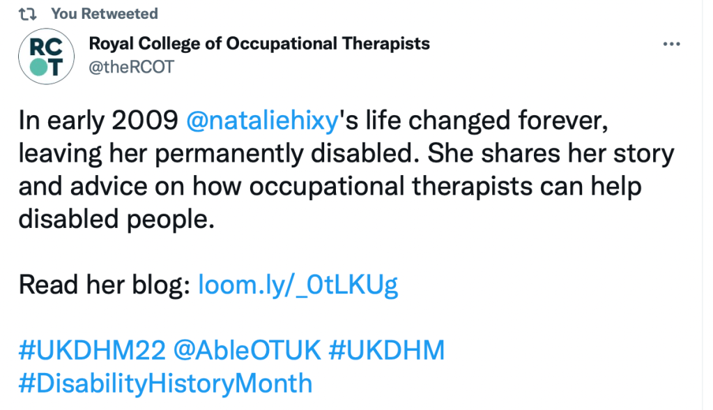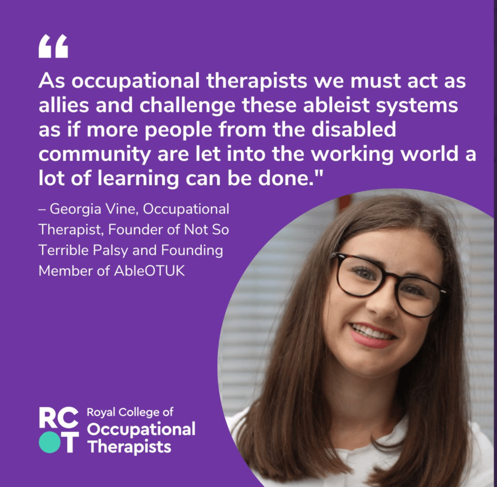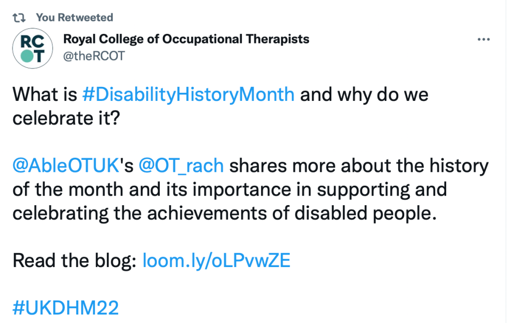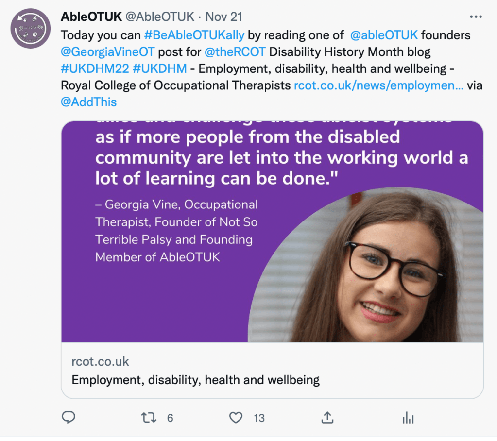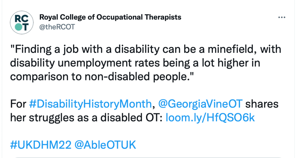 21st November 2022 Today you can #BeAbleOTUKally by reading one of @ableOTUK founders @GeorgiaVineOT post for @theRCOT Disability History Month blog #UKDHM22 #UKDHM – Employment, disability, health and wellbeing – Royal College of Occupational Therapists https://rcot.co.uk/news/employment-disability-health-and-wellbeing… via @AddThis