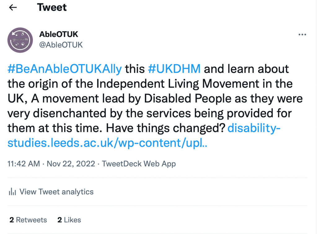 22nd November 2022 #BeAnAbleOTUKAlly this #UKDHM and learn about the origin of the Independent Living Movement in the UK, A movement lead by Disabled People as they were very disenchanted by the services being provided for them at this time. Have things changed? https://disability-studies.leeds.ac.uk/wp-content/uploads/sites/40/library/evans-Version-2-Independent-Living-Movement-in-the-UK.pdf