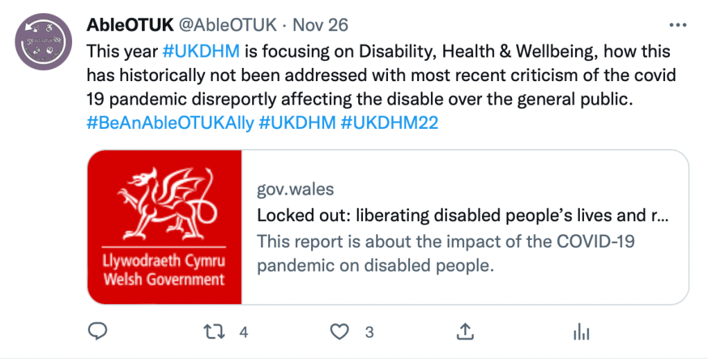26th November 2022 This year #UKDHM is focusing on Disability, Health and Wellbeing, and how this has historically not been addressed with most recent criticism of the covid 19 pandemic disreportly affecting the disable over the general public. #BeAnAbleOTUKAlly #UKDHM #UKDHM22 https://gov.wales/locked-out-liberating-disabled-peoples-lives-and-rights-wales-beyond-covid-19