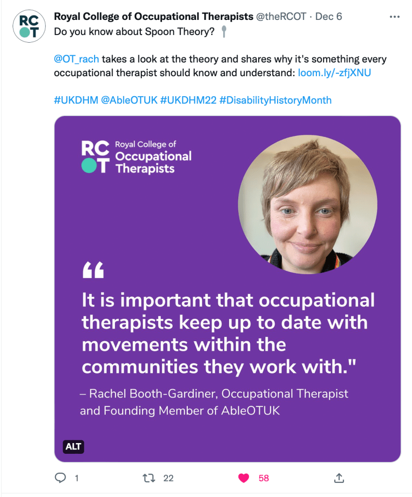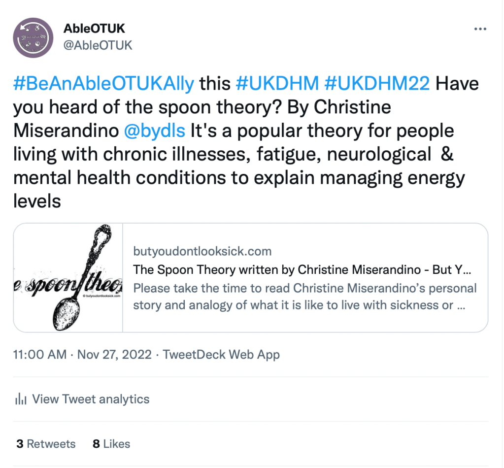 27th November 2022 #BeAnAbleOTUKAlly this #UKDHM #UKDHM22 Have you heard of the spoon theory written by Christine Miserandino @bydls it’s a very popular theory used by people living with chronic illnesses, fatigue, neurological & mental health conditions to explain how they manage their energy levels .#BeAnAbleOTUK and read about it here https://shar.es/afhbpT
