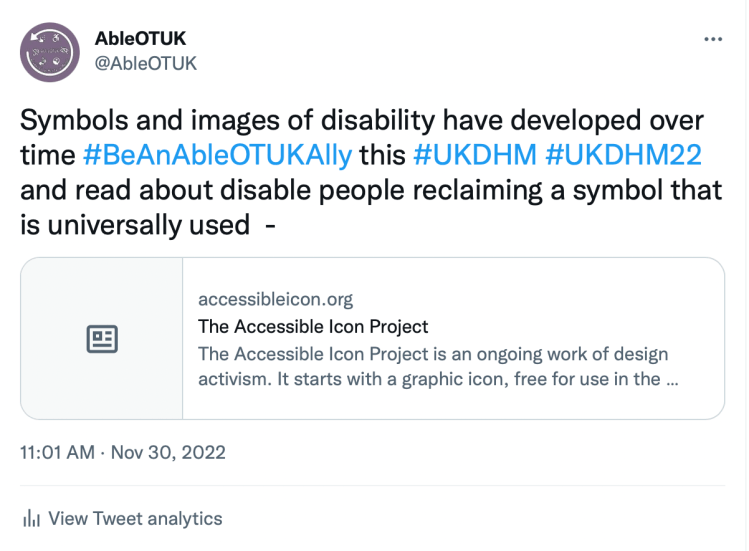 Symbols and images of disability have developed over time #BeAnAbleOTUKAlly this #UKDHM #UKDHM22 and read about disable people reclaiming a symbol that is universally used – https://accessibleicon.org/#use