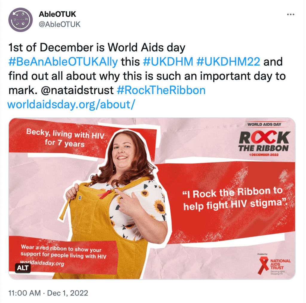 1st of December is World Aids day #BeAnAbleOTUKAlly this #UKDHM #UKDHM22 and find out all about why this is such an important day to mark. @nataidstrust #RockTheRibbon https://www.worldaidsday.org/about/