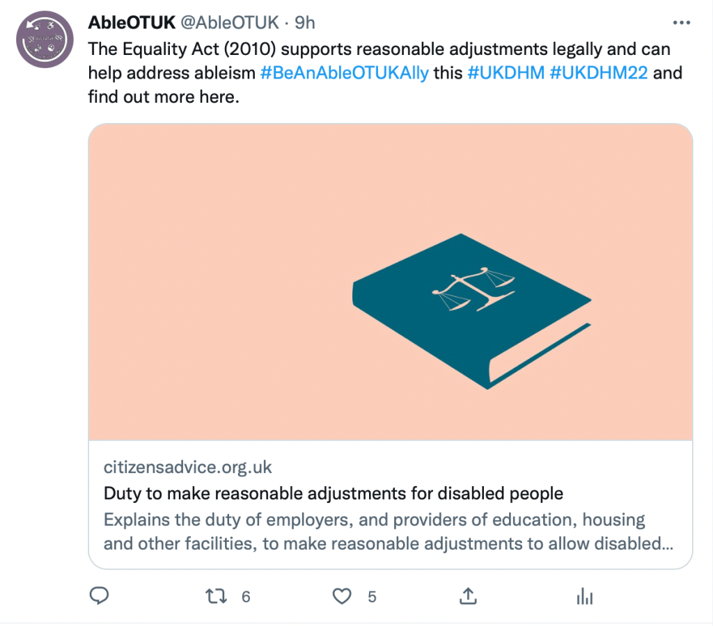 The Equality Act (2010) supports reasonable adjustments legally and can help address ableism #BeAnAbleOTUKAlly this #UKDHM #UKDHM22 and find out more here.