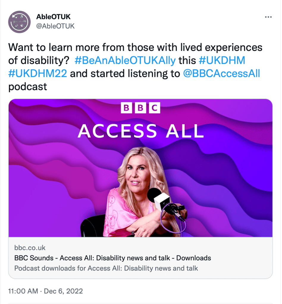 Want to learn more from those with lived experiences of disability? #BeAnAbleOTUKAlly this #UKDHM #UKDHM22 and started listening to @BBCAccessAll podcast link to podcast here