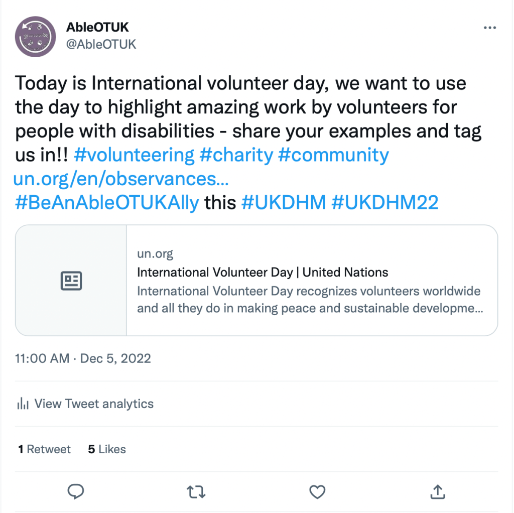 Today is International volunteer day, we want to use the day to highlight amazing work by volunteers for people with disabilities – share your examples and tag us in!! #volunteering #charity #community https://www.un.org/en/observances/volunteer-day #BeAnAbleOTUKAlly this #UKDHM #UKDHM22