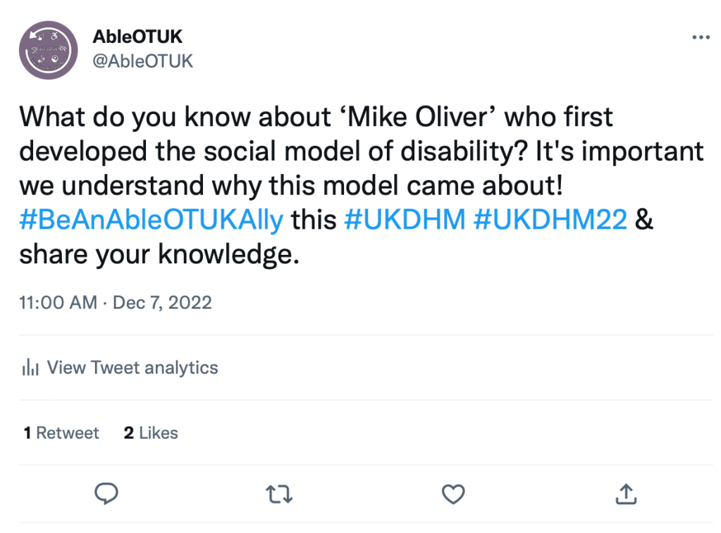 What do you know about ‘Mike Oliver’ who first developed the social model of disability? It’s important we understand why this model came about! #BeAnAbleOTUKAlly this #UKDHM #UKDHM22 & share your knowledge.