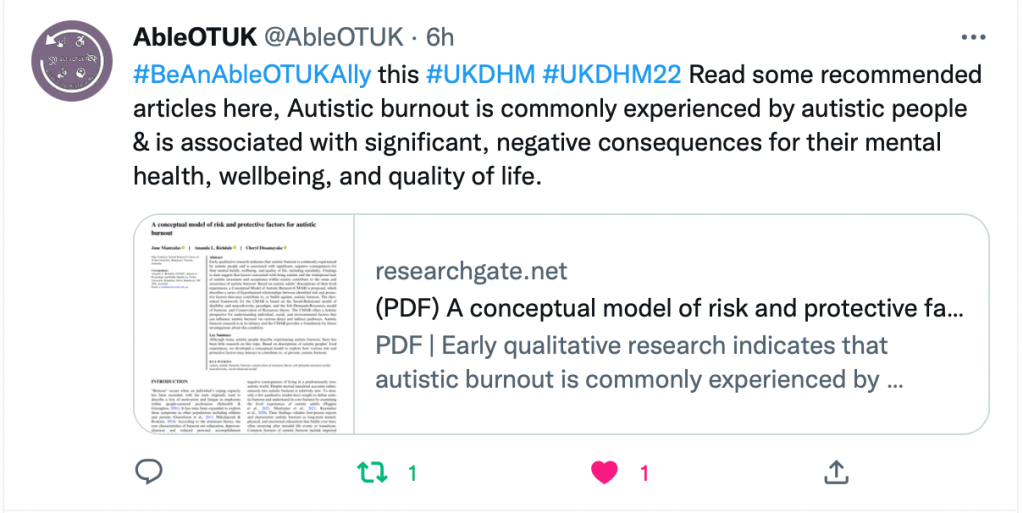 #BeAnAbleOTUKAlly this #UKDHM #UKDHM22 Read some recommended articles here, Autistic burnout is commonly experienced by autistic people & is associated with significant, negative consequences for their mental health, wellbeing, and quality of life. https://www.researchgate.net/publication/359924348_A_conceptual_model_of_risk_and_protective_factors_for_autistic_burnout