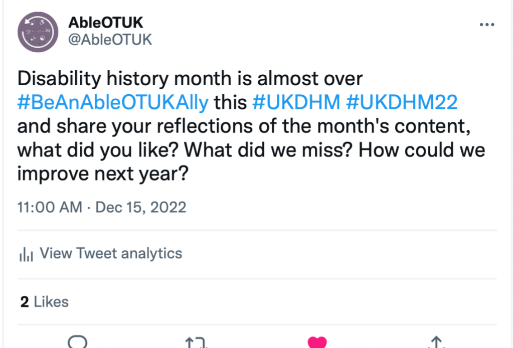 Thank you to everyone that has engaged with us during Disability history month, the team do this all as volunteers, If you would like to donate to our give giving page to help with running costs – we would be very grateful #BeAnAbleOTUKAlly this #UKDHM #UKDHM22 gofundme AbleOTUK