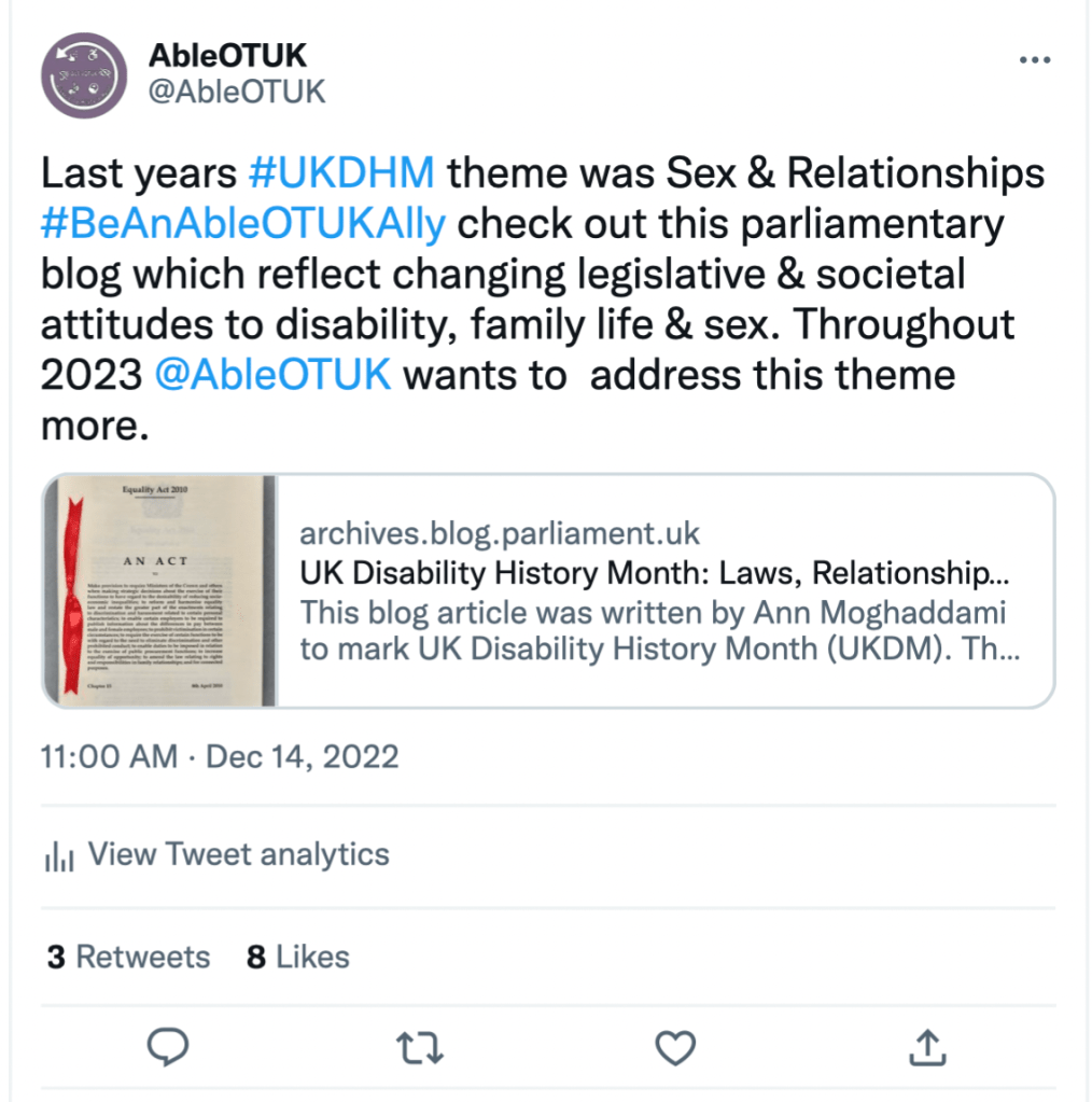 Last years #UKDHM theme was Sex & Relationships #BeAnAbleOTUKAlly check out this parliamentary blog which reflect changing legislative & societal attitudes to disability, family life & sex. Throughout 2023 @AbleOTUK wants to address this theme more.