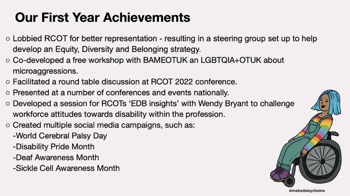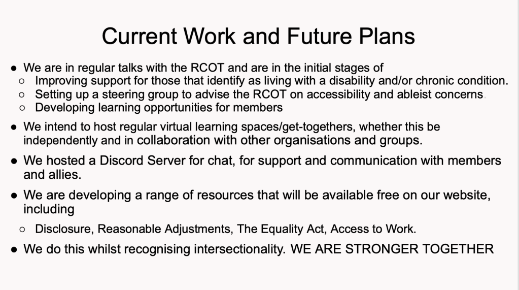 We hold monthly networking/support sessions on the first Wednesday of each month. These sessions are open to all UK-based occupational therapists/students who identify as disabled or have a long-term health condition.
