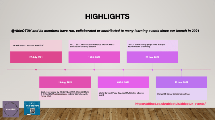 August 2021: Joint event hosted by @LGBTQIAOTUK, @BAMEOTUK & @AbleOTs Microaggressions webinar Workshop with Rayya Ghul.