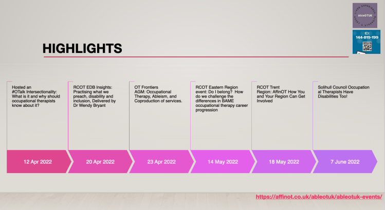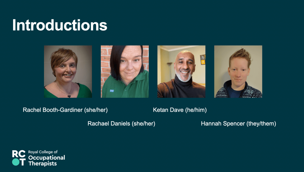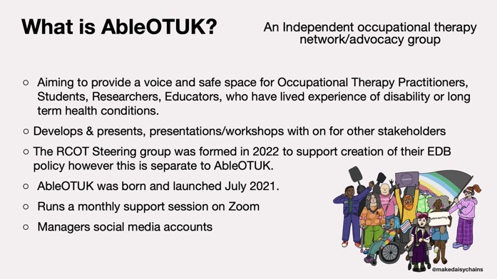 Wednesday 20 April 2022 RCOT EDB Insights: Practising what we preach, disability and inclusion, Delivered by Dr Wendy Bryant Followed by AbleOTUK team members on the Panel