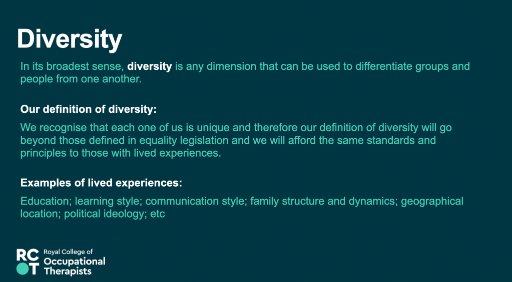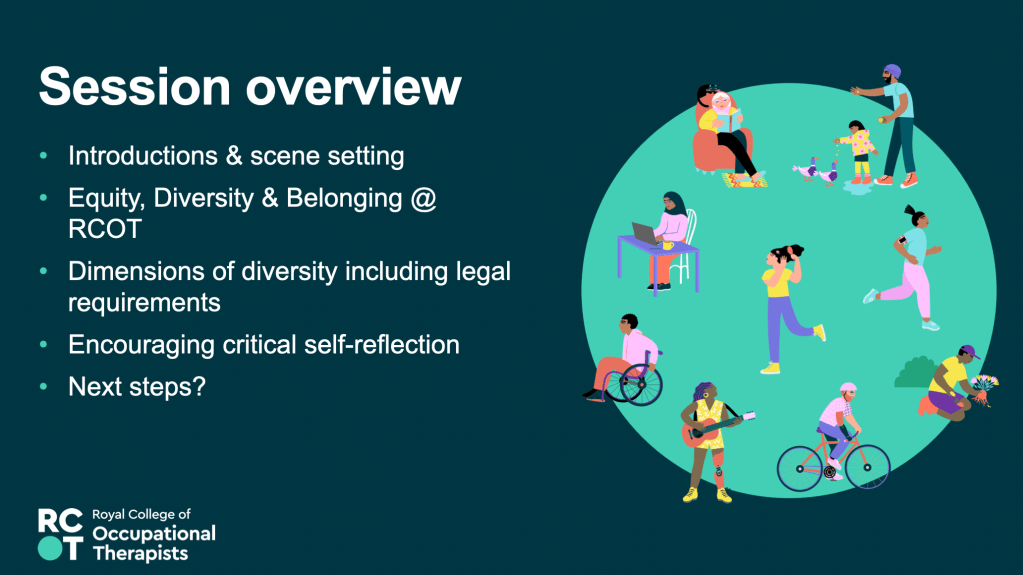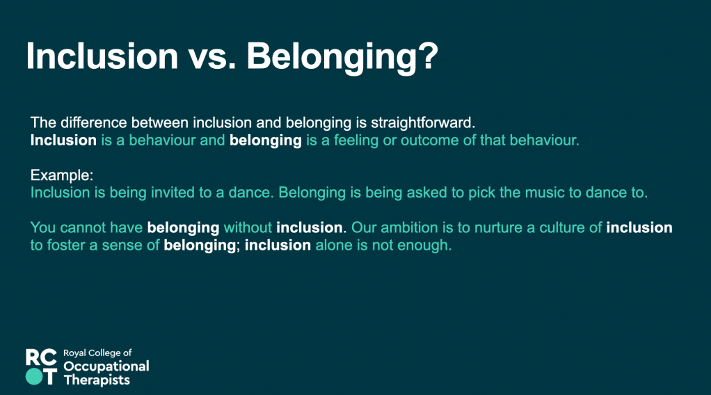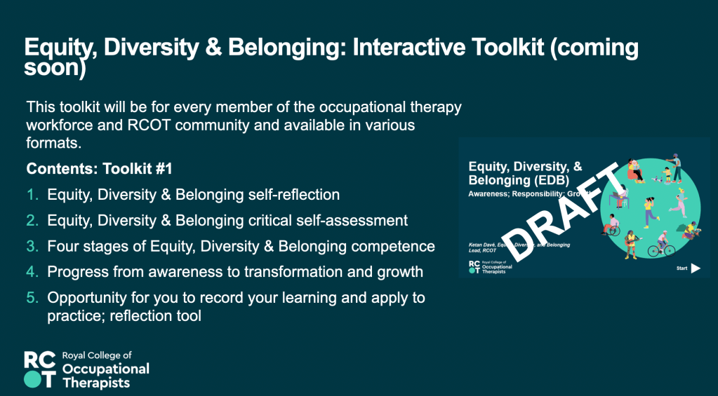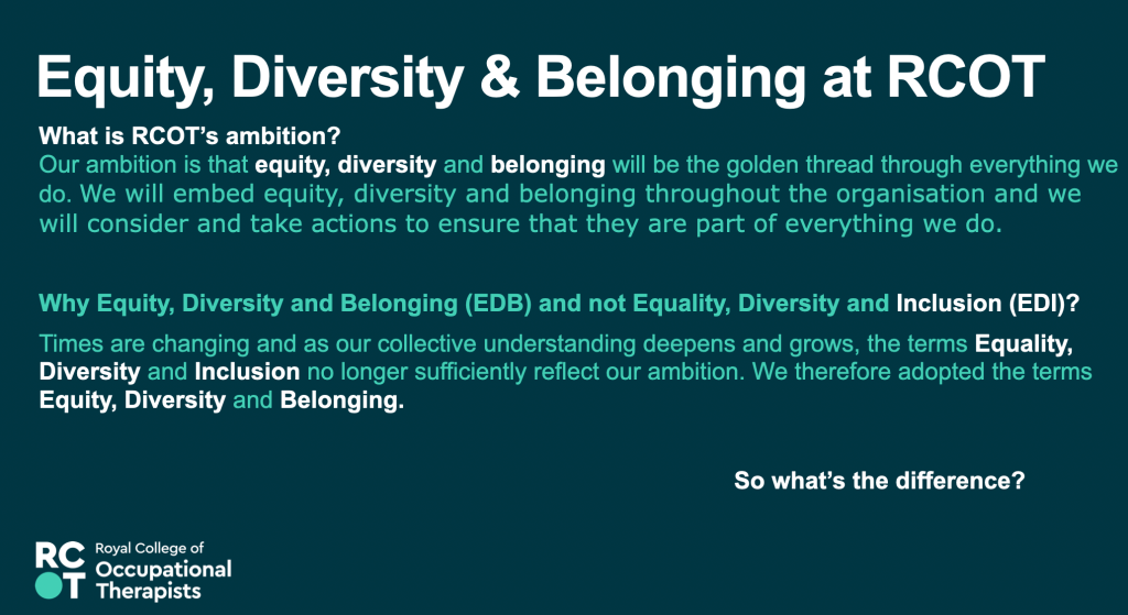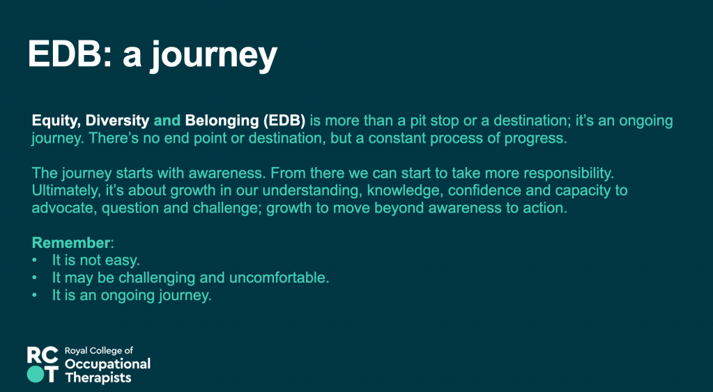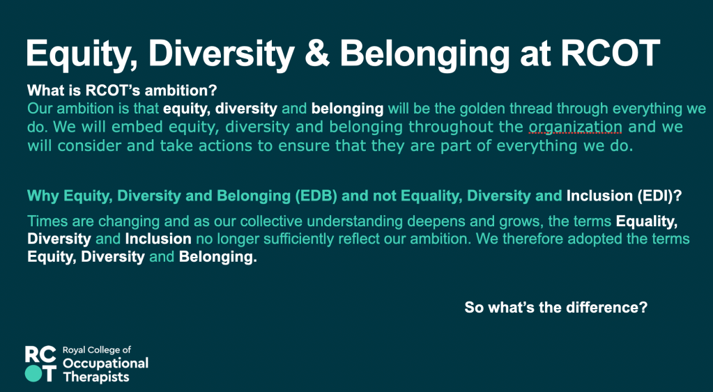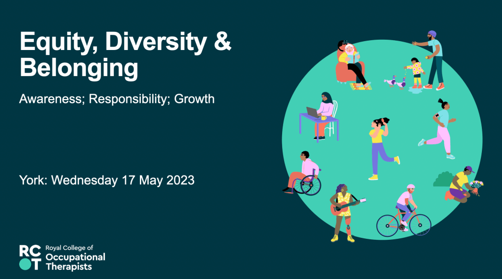 17th May 2023 – Equity, Diversity and Belonging – Awareness, Responsibility, Growth – Presentation at the RCOT Northern and Yorkshire regional come back learning event, join with LGBTQIA+OT and RCOT EDB manager