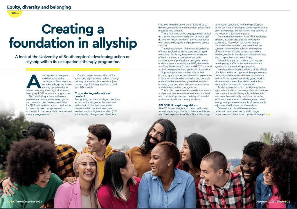 2nd February 2023 University of Southampton Equity, Diversity, Inclusion and Belonging – AbleOTUK Exploring Ableism, Activism and Allyship Workshop